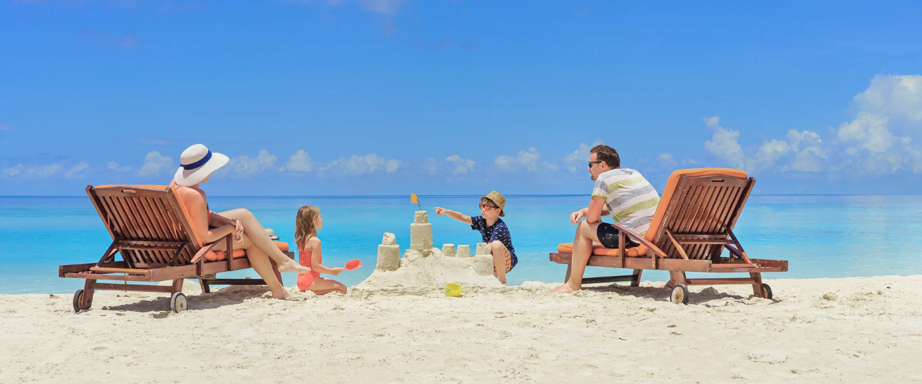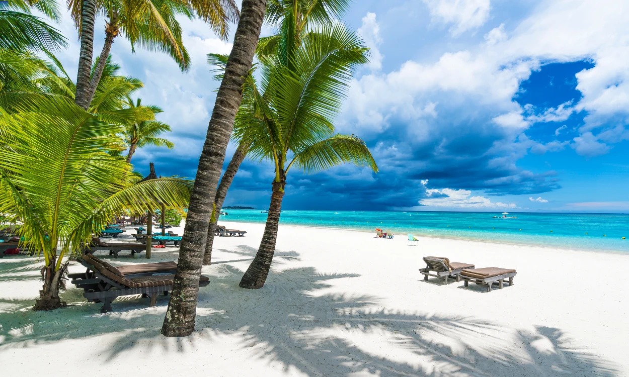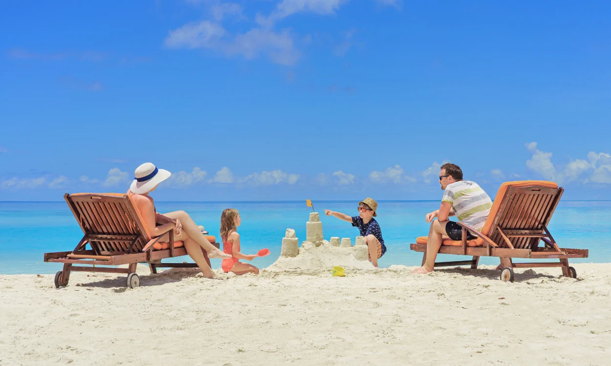 Onlineangebot zum Devisenwechsel über die Reisebank. Eine lächelnde Person mit dunklen, lockigen Haaren und einer runden Sonnenbrille sitzt entspannt in einem Liegestuhl an einem sonnigen Strand. Im Hintergrund sind der helle Sandstrand, das blaue Meer und ein klarer Himmel zu sehen, was eine Urlaubsatmosphäre vermittelt.